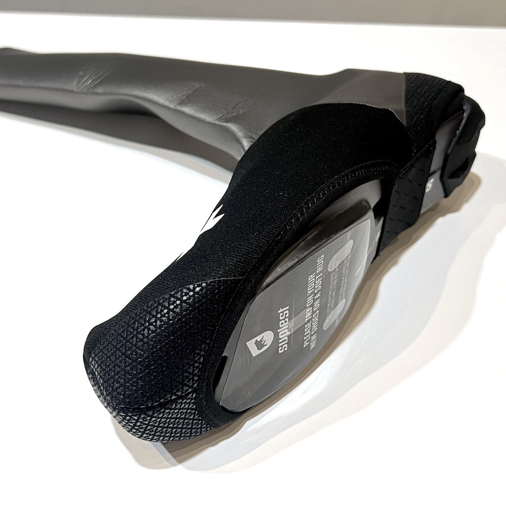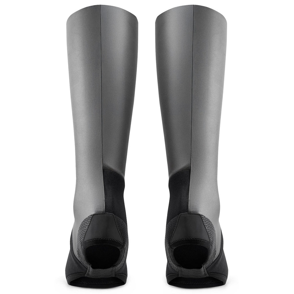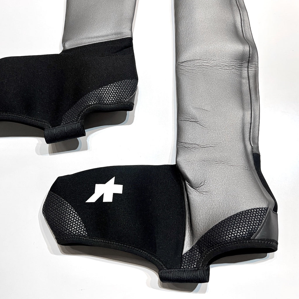 踵の下端部分から33cm(1サイズ)程度と、極端に延長されたシャフト部の丈により、多くの方において、ふくらはぎの最も太い部分くらいまで、グレー色の防水機能を有した素材で覆うことが可能です。この素材は、アソスのフラッグシップ ビブタイツ RS WINTER BIB TIGHTS の裾口に代々採用されている、暖かで防風・防水性があり、非常に柔軟で伸縮性に富んだ素材です。