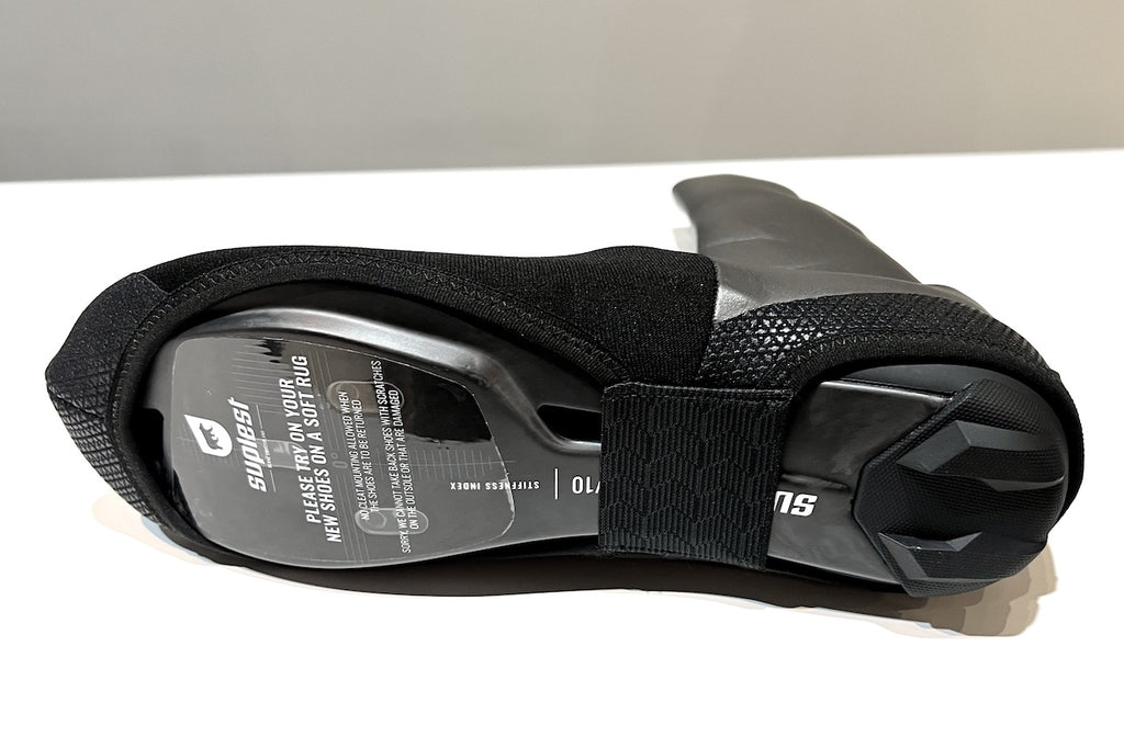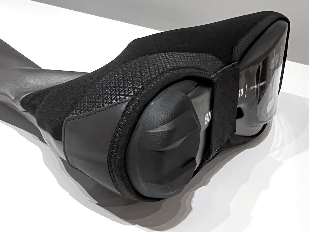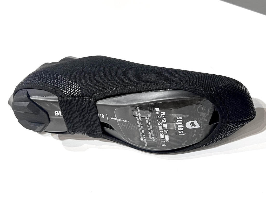 「押し歩き」というワードが出ましたが、この製品のもう一つの大きな特徴が、アソス初の SPDシューズにも対応したシューズカバーである点です。シューズに被せた際にアウトソール下側に回り込む部分を減らし、シューズ側面の土手部分までで生地を留めることで、アウトソール内部に埋め込まれている形状のマウンテンバイク・グラベルバイクなどに多いSPDクリートのシューズにも装着が可能となりました。昨今、歩けるサイクリングシューズを好むユーザーが増えている中では、嬉しい配慮かと思います。