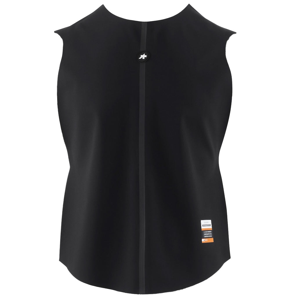 この製品の為に開発された新しいソフトシェル素材、HYPERPLUSH で構成された THERMO BOOSTER FOIL は、とてもシンプルで潔い作りが特徴。ノースリーブ製品の前面のようなカッティングにはなっていますが、首から下げたり、スナップボタンやフックなどで留めたりする機能はありません。ジャージやジャケットの中で、ただ2本のビブサスペンダーを利用し、それで挟んで身体の前面にあてがうだけの物です。